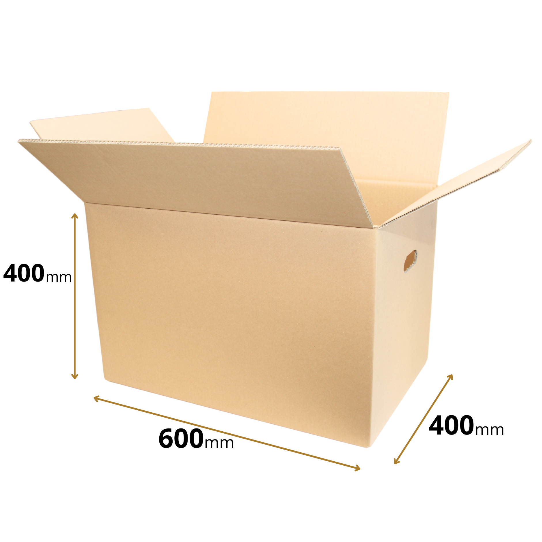 Brązowe pudełko klapowe o wymiarach zewnętrznych 600x400x400 mm.