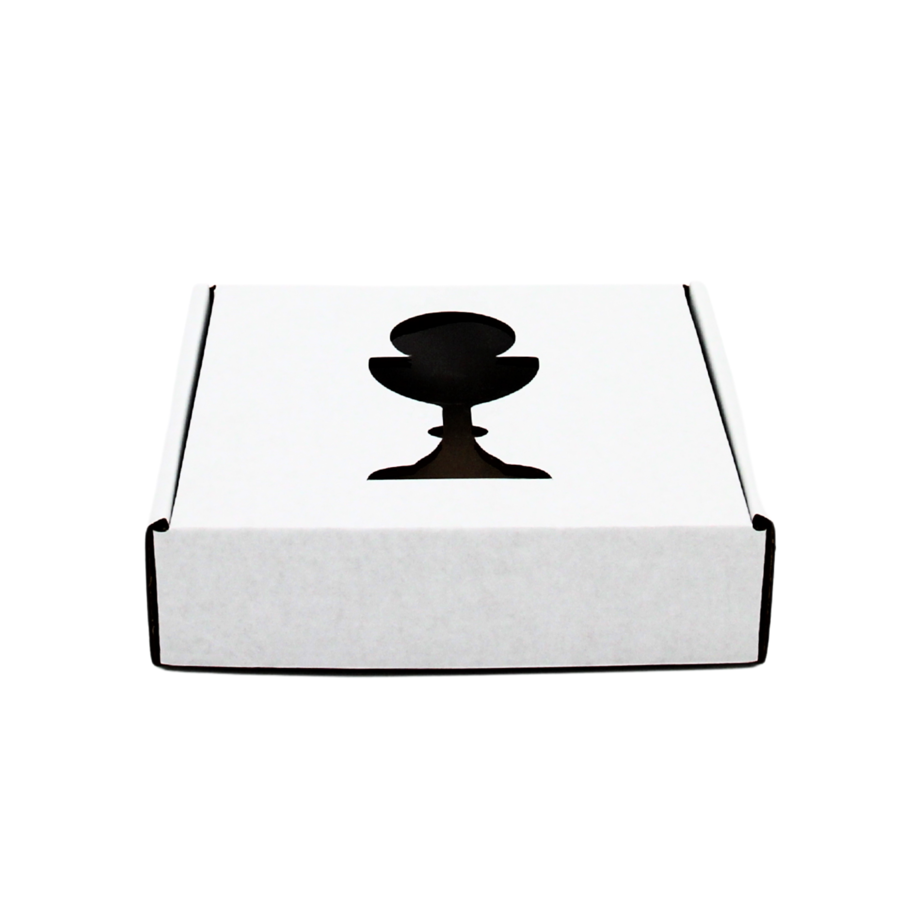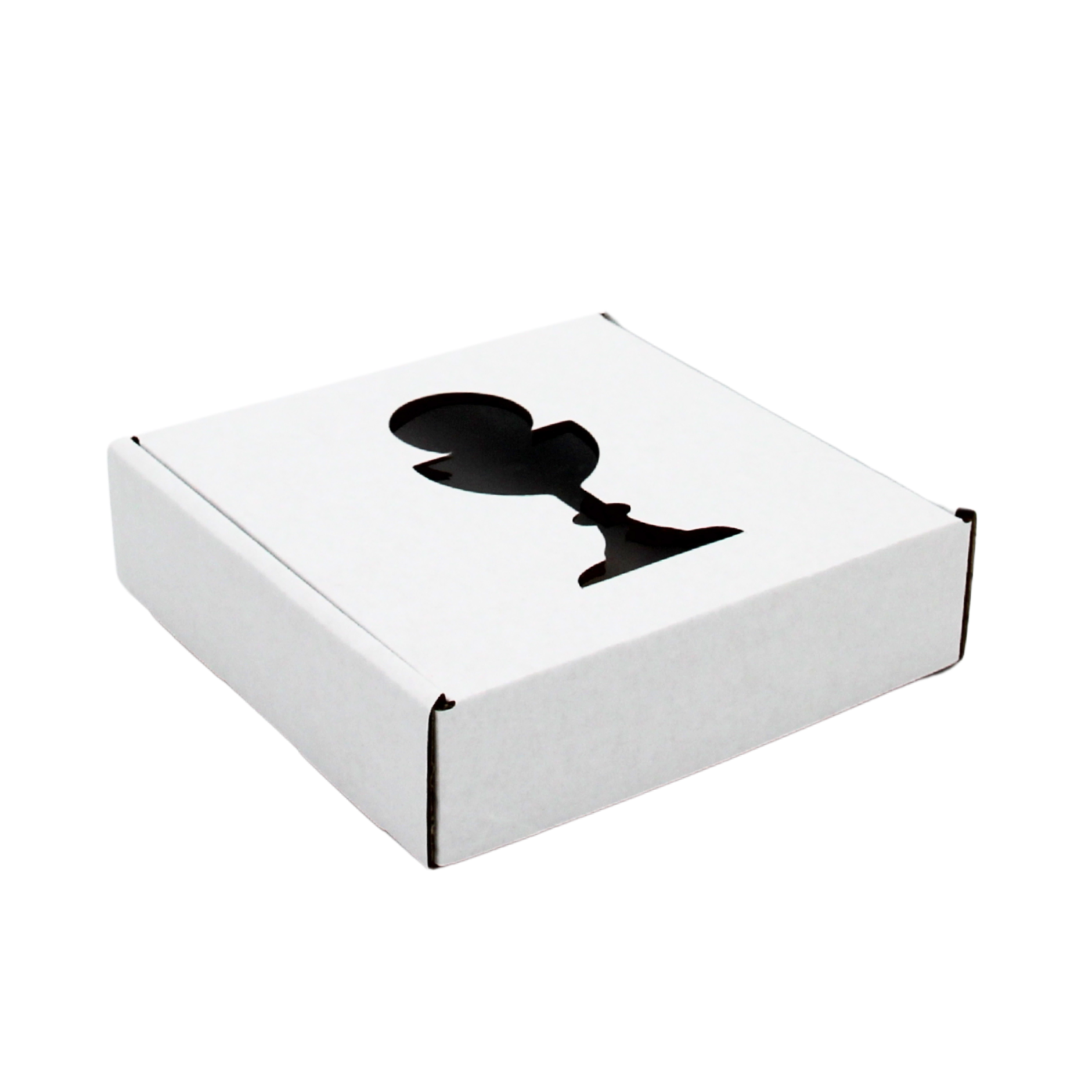 Pudełko z okienkiem w kształcie KIELICHA o wymiarach 300x300x50 mm. Karton nadaje się do zapakowania pierników, ciastek, prezentu na komunię itp.