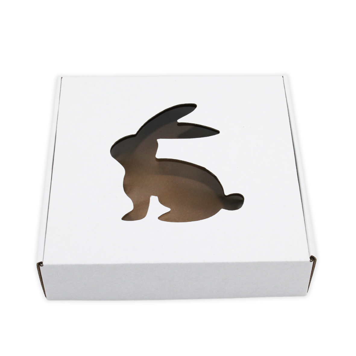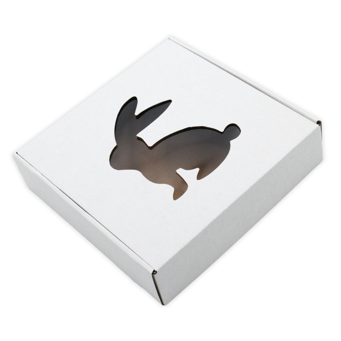 Pudełko z okienkiem w kształcie KRÓLICZKA o wymiarach 200x200x50 mm. Karton nadaje się do zapakowania pierników, ciastek itp.