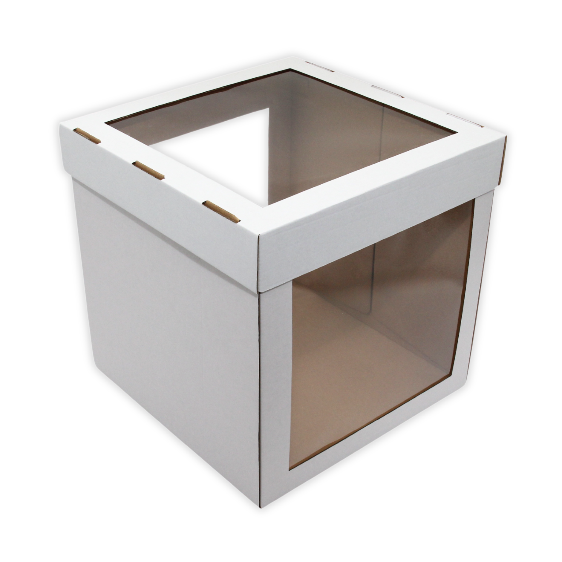 Pudełko o wymiarach 30x30x30 cm w formie podstawy oraz wieka górnego z potrójnym okienkiem. Karton nadaje się do zapakowania i transportu wysokiego tortu.