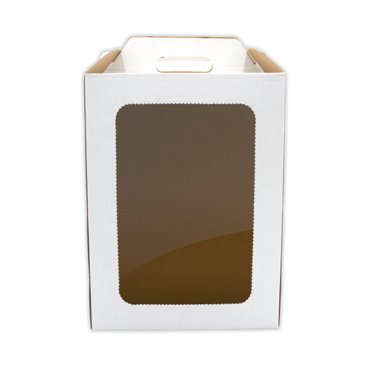 Pudełko na tort o wymiarach 26×26×35 cm w formie tzw. „koszyczka” (z okienkiem). Karton nadaje się doskonale do pakowania i transportu wysokich tortów — dzięki solidnej trójwarstwowej tekturze i eleganckiemu przezroczystemu okienku w wieczku.